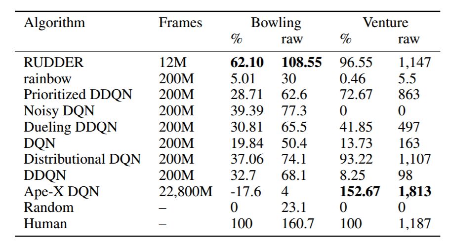 表 1:RUDDER 和其他方法在学习 Atari 游戏 Bowling 和 Venture 时的结果。在无操作指令开始条件下,各个方法在超过 200 个测试游戏中的归一化人类得分和原始得分:A3C 得分未报道,因为其在无操作指令开始条件下无法获得。其他方法的得分来自于之前的研究 [8, 39]。我们选择了仅基于 12M 帧训练损失的 RUDDER 模型。