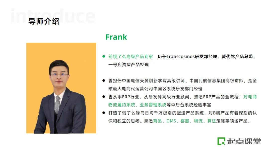 Frank老师作为一个有着近16年IT老兵,曾任前饿了么高级产品专家,历任Transcosmos研发部经理、爱代驾产品总监、一号店资深产品经理等职位。