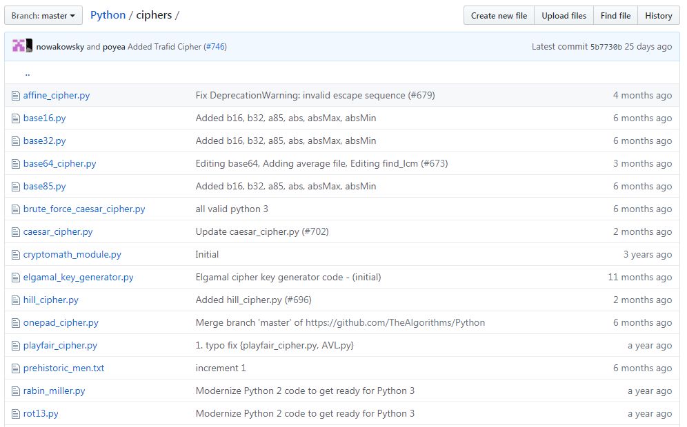 在 ciphers 这一部分,作者给出了base64等编码的转码操作,并针对凯撒密码等加密方法给出了相应的实现代码。部分代码如下。
