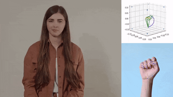 继我们近期在 TensorFlow.js 中发布 BlazePose GHUM 3D 之后,我们还在这个版本中为手部姿态检测增加了指标尺度的 3D 关键点预测,食指、中指、无名指和小指第一指节的平均值作为辅助关键点,表示原点。我们的 3D 真实值基于一个名为 GHUM 的统计学 3D 人体模型,该模型的构建利用了人体形状和运动的大型语料库。