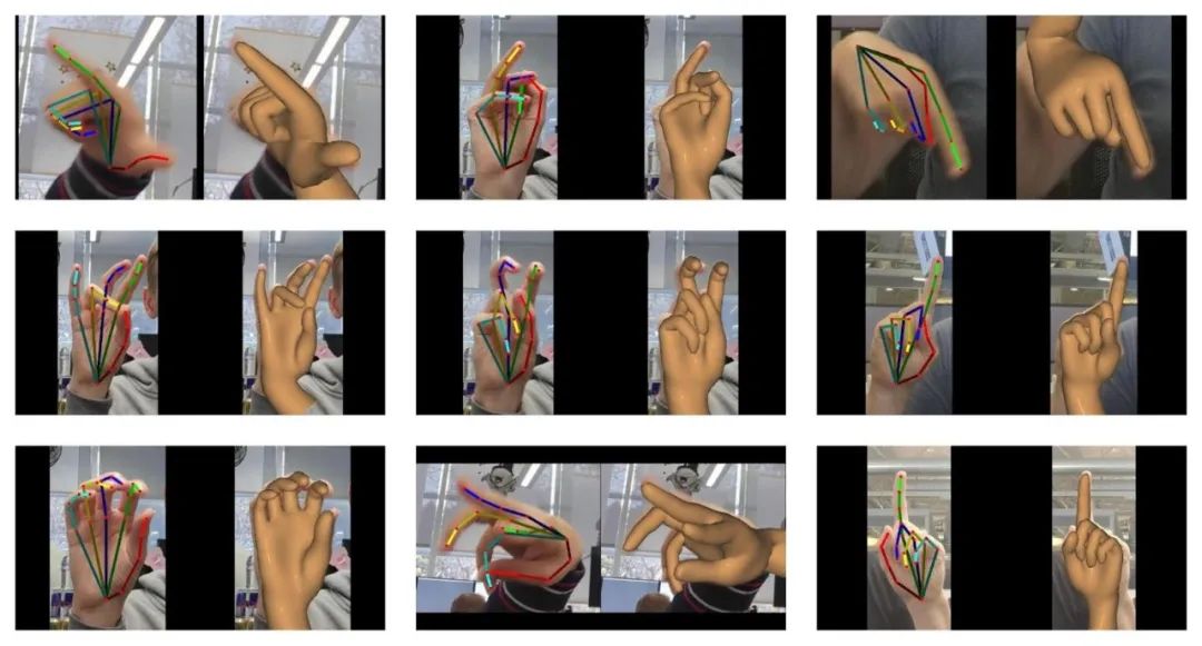 叠加了 2D 关键点注释的手部图像 GHUM 手部拟合样本。利用这些数据来训练并测试各种姿态,能够更好地检测更多极端姿态