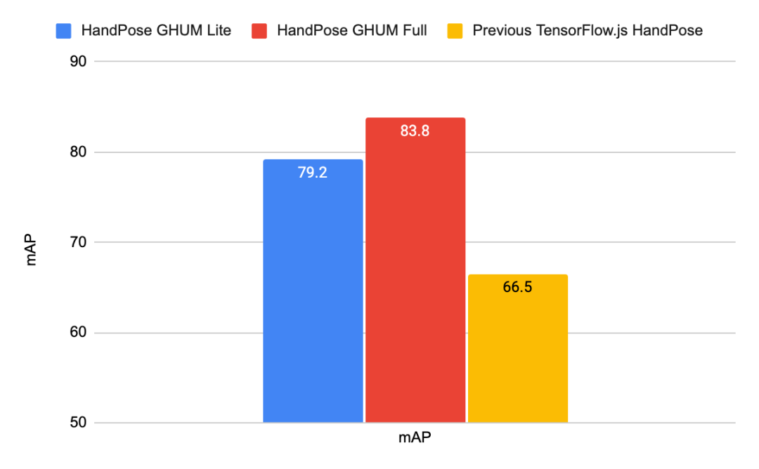 在新版本中,我们大幅提高了模型的质量,并在美国手语 (ASL) 手势数据集的基础上对模型进行了评估。我们采用了 COCO 关键点挑战方法所建议的平均精度 (mAP) 作为 2D 屏幕坐标的评估指标。