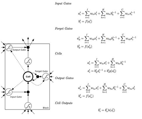 下面的公式中,都是把input summation以及activation过程单独列出,a是summation的结果,b是activation的结果。为了方便讲解把两个图放在一起对照。公式中之所以写Cell Output而不是Block Output,主要是因为一个Block可能包含多余1个的Cell,;同时,