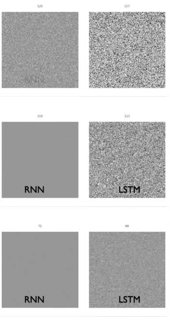 用一个实际的图来对比标准 RNN 和 LSTM 在 vanishing gradient 问题上的结果,途中的噪声表示梯度的值。可以明显看出 LSTM 对梯度的传递可以更加持久: