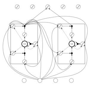 最后补一个图,是同一个 hidden layer 不同的 LSTM memory block 之间的递归关系示意图: