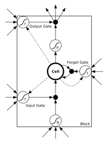 现在对单一 memoryblock 展开,一个 block 里面包含至少一个 memory cell ,以及三个乘法单元:输入门、输出门、忘记门。这三个门分别模拟对 memory cell 的写、读、重置操作。下图是 LSTM memory block 的示意图,内含一个 memory cell ,和三个 gate 。大圆圈内的操作表示要对输入进行 sigmoid 变换,f 表示 logistic,g 和 h 表示 tanh ,当然也可以是 logistic :