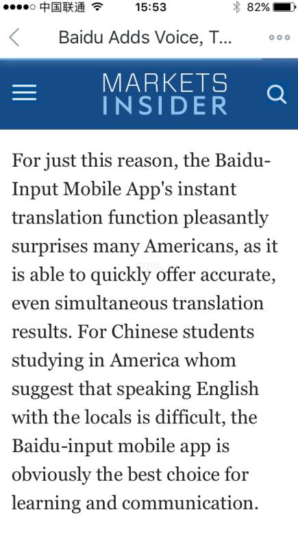 (中文大意:百度输入法的即时翻译功能让许多美国人感到惊喜,因为它能够迅速提供准确的、类似同声传译的翻译结果。对于在美国学习的中国学生来说,和当地人说英语很困难,百度输入法显然是学习和交流的最佳选择。)