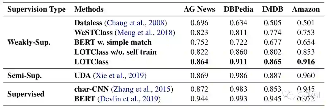 为了验证LOTClass的效果,论文在4个分类数据集上与监督、半监督和弱监督进行了对比。