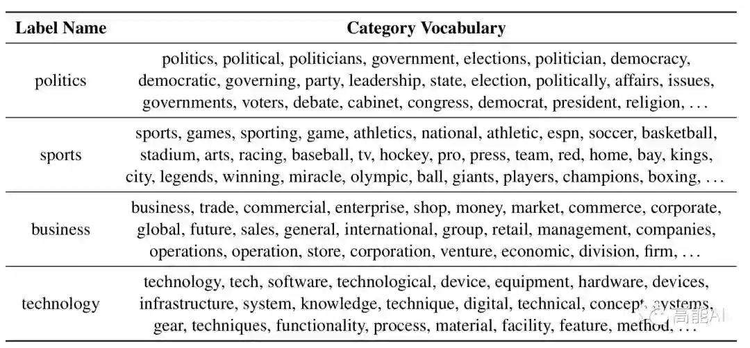 通过上述方式找出了AG新闻语料每一个类别-标签名称对应的类别词汇表,如上图所示。