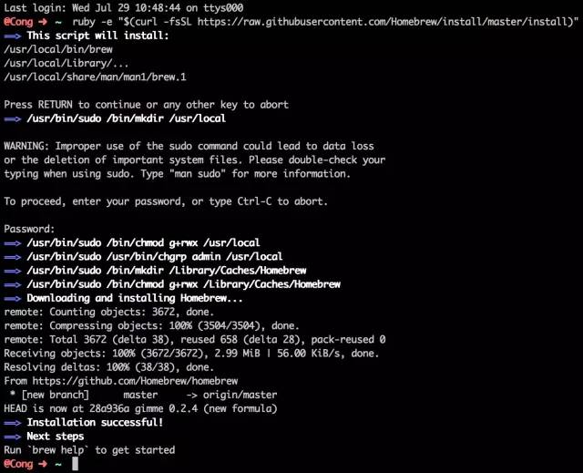 Homebrew就是这样一款终端下的命令程序包管理器,安装非常简单,复制如下命令在终端下运行,按回车并输入密码后等待安装成功: