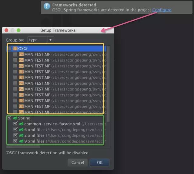 一路点击[Next]进入主界面,IDEA会帮我们自动检测到依赖的框架,如图IDEA发现我们使用了OSGI和Spring框架,点击[Configure],然后去除OSGI依赖,因为SOFA项目不是完全实现OSGI规范的,勾选Spring配置文件。