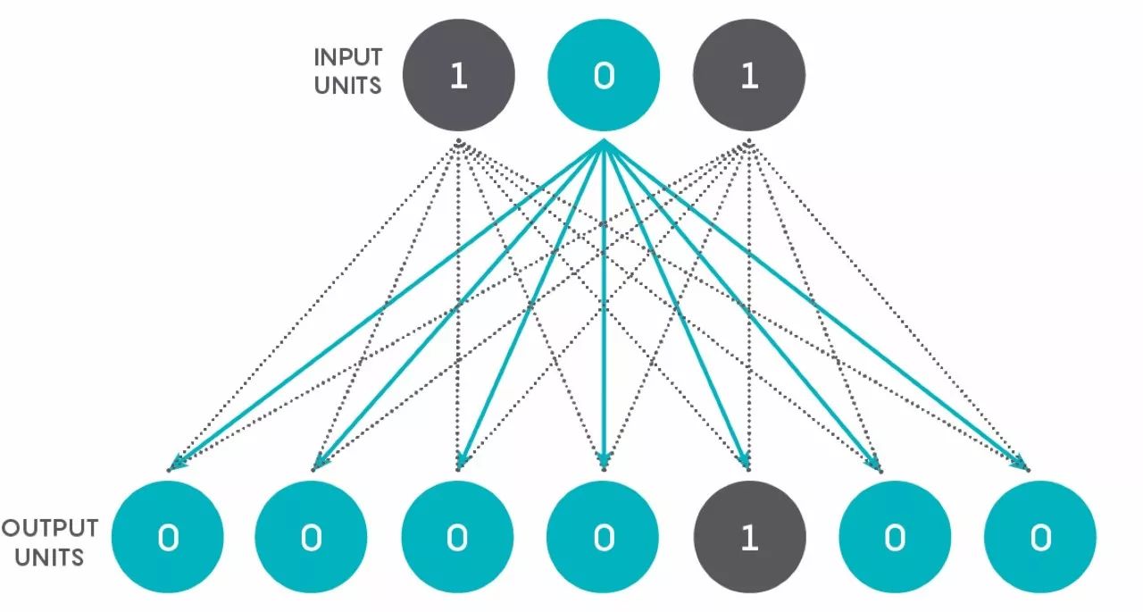 现在问题是:是否能通过调整连接权重以及 7 个输出单元的阈值,使每个二进制数字输入仅能激活一个对应的输出单元,而其他输出单元都处于休眠?激活单元的位置反映了二进制输入所代表的值。所以,如果原始输入为 001,应该仅有最左侧的输出单元(手机用户是最底部的单元)被激活,同理,如果原始输入为 101,则应该是从左数第 5 个(手机用户则为从底部数)输出单元被激活,以此类推。