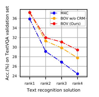 图 3 BOV与M4C在不同OCR结果时的比较(rank1至rank4的OCR准确率逐步下降)