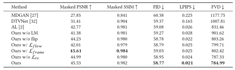 图1 与已有方法生成的视频比较,选取一张生成的视频帧为例。右下角是可视化光流用来描述视频的运动信息。