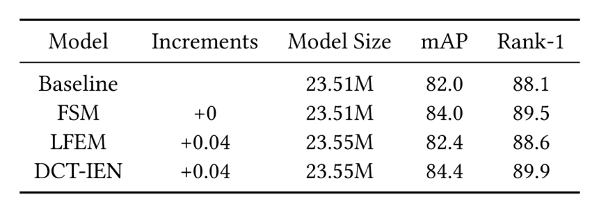 表1给出了本文方法在MARS数据集上的消融实验,验证了判别信息和共享信息对视频表征均具有重要意义的猜想。表2给出了本文网络结构的模型参数量,可以发现相比于基线模型,本文方法仅仅增加了0.04M的参数,实现了效率和性能的良好平衡。如图3所示,将DCT-IEN与前沿方法在MARS和iLIDS-VID数据集上进行比较,结果表明本文方法均达到SOTA性能。