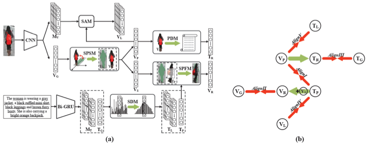 基于文本描述的行人重识别任务致力于根据所提供的文本描述在大规模的图像数据库中检索得到相应的行人图像。本研究针对跨模态行人重识别任务展开研究,并提出了一种深度环境行人分离学习模型(Deep Surroundings-person Separation Learning model, DSSL)。现有算法一般都致力于学习一个公共空间映射,以从异质的多模态数据中提取富有鉴别能力的特征。但由于高维数据的复杂性,无约束的映射方法很难在正确捕捉行人特征的同时剥离掉干扰信息。直观上看,图像数据中包含的信息可以分为行人信息与环境信息,二者为互斥关系。