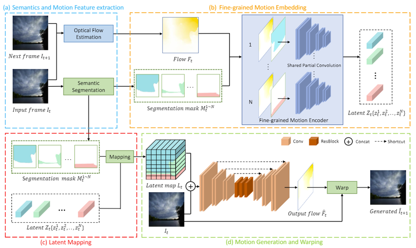 如图一中AL的结果,显式地使用光流作为运动信息的表达使得运动和内容学习可以分开进行。然而由于光流本身缺乏语义性,很难直接从光流学到与图片的对应关系。为解决上述问题,本文使用语义信息为引导,将运动信息嵌入到不同的语义空间,得到更加细粒度的运动表示,从而生成具有更加真实动态效果的视频。如图二所示,模型的编码器使用部分卷积 (partial convolution) 来根据不同的语义分割图对整张光流进行嵌入学习,得到细粒度表达。再根据输入图片的语义分割图重新排列这种表达。模型的解码器根据以上信息生成下一帧的光流预测,从而循环地生成整段视频。