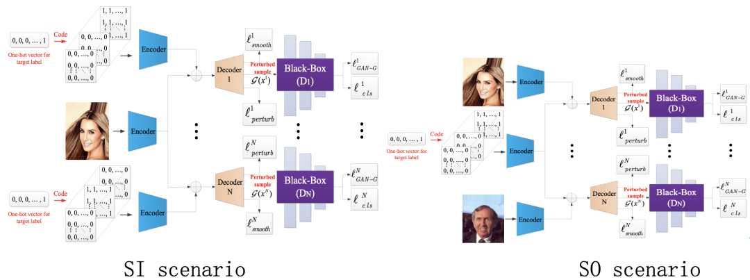 为解决上述困惑,本文提出多黑盒攻击算法简称为MBbA。如图2所示,该方法主要针对两种场景:相同训练集(SI)和相同输出(SO)。MBbA首先采取多个编码器将输入图像和攻击目标编码到关联空间中,然后解码器根据编码器输出特征去生成相应的对抗样本,此时多个损失函数来确保生成对抗样本的有效性。最后这些对抗样本用于攻击目标模型,同时也用于提升模型的防御能力。