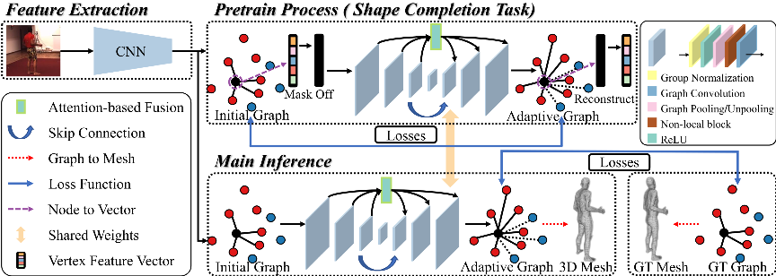 针对上述问题,本文提出了一个深层网格关系捕捉图卷积神经网络(Deep Mesh Relation Capturing Graph Convolution Network, DC-GNet)。首先,通过引入一个自适应邻接矩阵来同时学习人体节点间的正负相关的关系。通过学习人体内部节点间更细微的关系,模型从而习得捕捉复杂的人体局部结构的能力,如图1(b)所示。此外,提出了一个形状补全任务,即人为的在人体模型的表面上制造孔洞。而为了恢复缺失的信息,迫使网络模型从现有存在的邻接节点中推理必要的信息,如图2所示。户外环境下存在大量的遮挡情况,而大多数现有的室内数据集则缺少必要的遮挡样例。基于这样的数据集训练得到的模型通常会遭遇急剧的性能下降,而基于该形状补全任务训练的模型则能够从现存富有的室内数据库中习得人体遮挡的先验信息,从而很好的处理自然环境中的遮挡情况。该方法的流程示意图如图3所示。