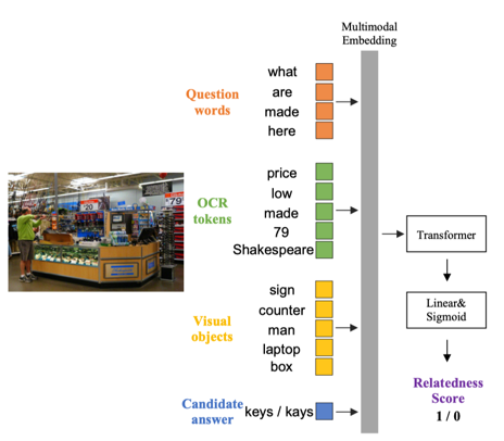 图1是BOV模型的整体框架,它基于Transformer网络实现问题、图像文字和视觉物体三种模态信息的交互。区别于之前的方法,BOV在文字模态和物体模态分别设计一个模块来实现视觉到语义的映射,从而获得视觉增强的文字表征和语义导向的物体表征,目的是增强特征表示的鲁棒性,减小OCR错误和物体识别错误对推理的影响。另外在答案预测模块提出一个如图2所示的上下文感知的答案修正模块(CRM)对“复制”的答案词进行校正。