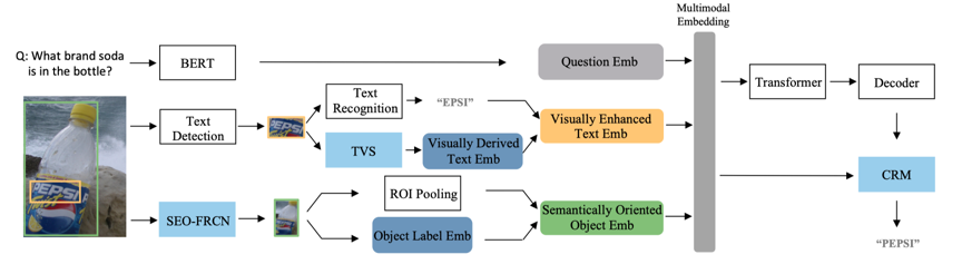 为了解决通用视觉问答(VQA)方法无法处理图像中文字信息的缺陷,文本视觉问答(TextVQA)任务被提出。TextVQA为了回答与图像中文字相关的问题,需要同时考虑视觉场景和文字等多个模态的信息及其关系,具有很大挑战。目前主流的方法通过引入一个外部的光学字符识别(OCR)模块作为前处理,再将其与VQA框架结合预测答案,这会使得TextVQA性能很大程度上受到OCR精度的影响,具体表现为以下两种误差累积传播现象:1)OCR错误使得对文字的直接语义编码错误,导致多模态信息的交互推理过程出现偏差,从而无法定位出准确的答案。2)即使是在推理和定位答案正确的情况下,OCR错误仍然会导致最终从OCR结果中“复制”的答案错误。另外,视觉物体模态与图像文字、问题模态交互时存在语义间隔,使得多模态信息无法有效融合。