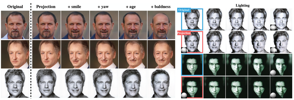 因为上述过程对一张人脸图像编辑需要提供该人脸的全部对应属性标签,对使用时不便利且不便于编辑无法提取到属性标签的图片,如艺术画人脸,且基于对我们模型编辑某种语义后的向量观察发现语义信息能被提取成方向向量,因此本文提出一种基于训练好的SSFlow,提取出每种语义属性对应的方向向量,使得编辑只需要让w向量沿着方向向量上移动即可实现。部分实验结果如图2所示。如表1所示我们在FFHQ数据集上也表现出更好的效果。