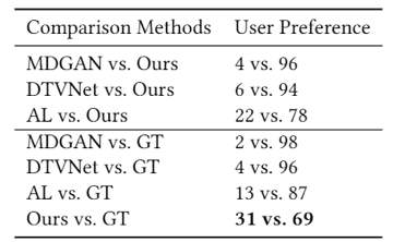 同时我们也基于Flickr收集了一个大规模的延时视频数据集 Time-lapse-D。该数据集是至今为止最大的、具有最多种类的延时视频数据集。在一系列客观和主观评测指标上,我们的模型都取得了至今为止最好的效果:图三、四。图三中我们同时选取图片和视频的评测用来衡量生成视频的帧和运动。图四中我们设计了一个用户评价来测量人类视觉上的主观感受。