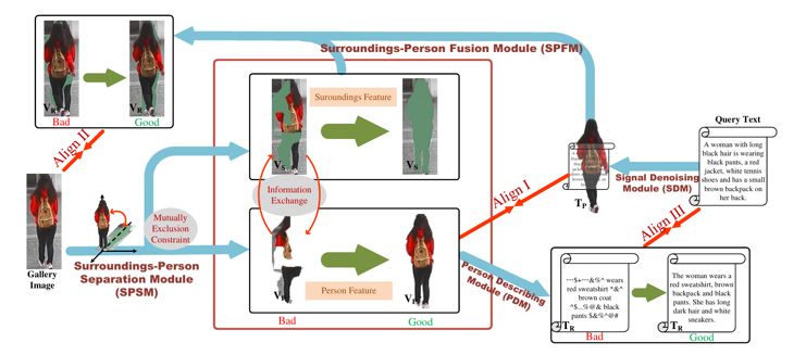 在大多数实际应用场景中,文本描述的提供者并不知道目标行人所处的场景与环境,因而文本中基本只包含行人信息。基于这一观点,论文中提出了一种深度环境行人分离学习模型(DSSL)进行高效精准的行人特征提取与匹配。如图1、 2所示,环境行人分离与融合机制(SPSM+SPFM)起到了关键性的作用,在信息正交约束下,通过行人特征的分离与跨模态融合重构匹配,采用五种不同的跨模态多粒度信息对齐方式,在训练过程中相互制约与引导,从而实现精准的环境行人剥离与匹配,极大提升了模型精度。