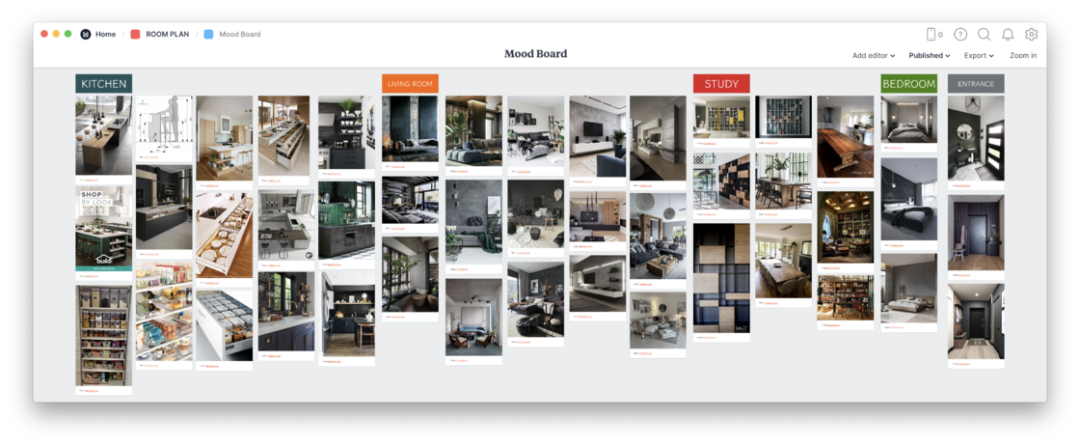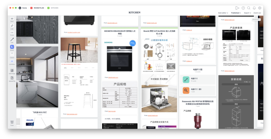 Milanote 的优点是它所有页面(Board)都是无限嵌套的,并且所有添加的图片、文字、视频、超链接和文件都可以自由移动,同时有一个体验完备的 Chrome 插件,所有我想要从页面抓取的信息都可以直接从源页面抓取到 Milanote 里的任意 Board 中并且附上源地址。最后可以通过链接或导出 PDF 分享给别人,除了给设计师看我的设计喜好,后期我还用它和设计师对接软装采购,甚至柜体定制时与工作室沟通嵌入式电器尺寸也是用它完成。