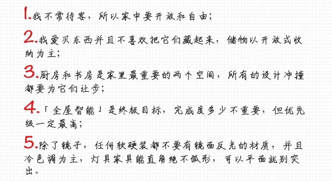 尽管如此,在具体的格局、灯光、色彩方案和收纳等地方,设计师可能会依照自己过往的经验和默认习惯来设计,但家一定是要能取悦自己的,所以我给了她一些比较具体的要求: