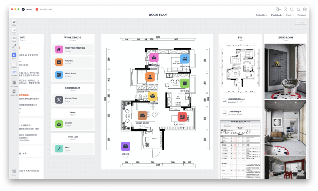 Milanote 是一个自由度非常高的剪贴板,基本上我所有和装修相关的信息都放在里面,从我相中的家具店地址,到平面图、设计渲染图、购买清单甚至相关的合同文档都整理了进去。