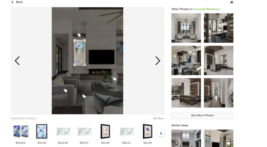 除了获取灵感,houzz 有一个我很喜欢的 Feture 是可以从照片里捕获产品的购买方式,尽管精确度有限,但仍然可以按图索骥找到一些不错的替代品。
