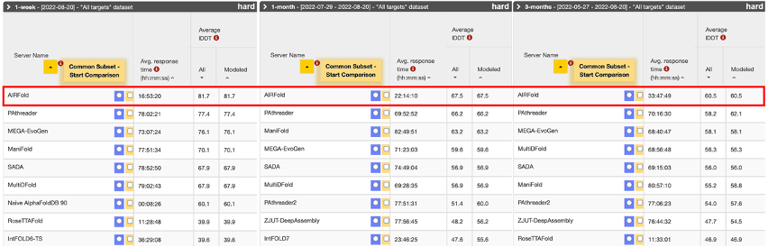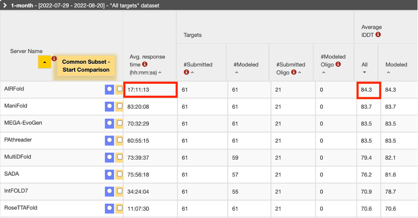 AIRFold 在最近一个月(7.23-8.20)的评估中连续四周全球第一,并在系统响应时间上远远领先其他团队