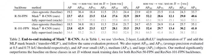 由于没有注释可用,因此他们无法在 VG 数据集上显示精确度。 所以他们把这个想法应用到可以证明结果的数据集上。PASCAL-VOC 有 20 个等级,在 COCO 中都很常见 。因此,他们使用 VOC 分类标签进行培训,并且只使用来自 COCO 的 bbox 标签对这 20 个类进行训练。 针对在 COCO 数据集的 20 个类的实例分割的任务的结果如下. 反之亦然,因为这两个数据集中都有真实值(Ground truth),这个结果列在下面的表格中。