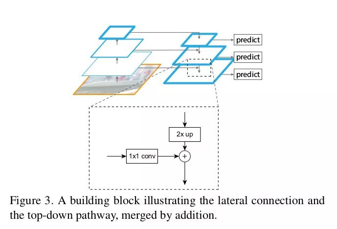 侧向连接:通过 1x1 卷积并与经过上采样的从上到下连接的结果相加求和。自上而下的部分生成粗粒度特征,自下而上的部分通过侧向连接加入细粒度特征。原文的图示表达的非常明了。