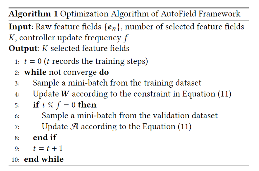 由于深度推荐模型以及控制器网络相互依赖,在训练集上同时训练深度推荐模型的参数以及控制器网络的参数将导致过拟合问题。因此,本工作采用类似DARTS的优化方法,在验证集上更新控制器网络,在训练集上更新深度推荐模型。具体的优化算法如上图。