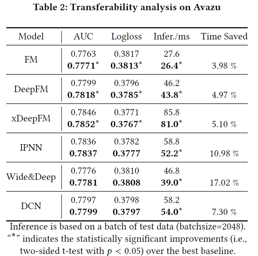 在Avazu上进行迁移实验。基于Embedding + MLP的深度推荐模型搜索得到的特征选择结果迁移到其他模型上,也可以帮助其他模型增强推荐效果。同时,使用更少的特征字段也帮助缩短模型的推断时间。