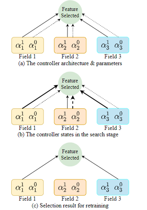 如图中(a)所示,我们首先初始化控制器网络的参数,将每个字段的两个参数设置均为0.5 (图中线的粗细表示对应参数的大小,实线表示被选中,虚线表示被放弃)。如图(b)所示,随着搜索阶段的进行,更有用的特征字段对应的