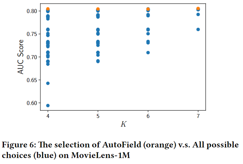 我们在Movielens1M上进行实验,发现AutoField对任意的K,都可以取到最优的特征选择结果。图中蓝色点表示遍历的特征组合的效果,橙色点为AutoField选择的特征组合取得的效果。