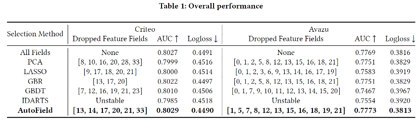 在两个数据集上,在使用特征字段数量一样或者更少的情况下,相比其他所有特征选择的方法,AutoFIeld均取得了最佳的效果,且好于使用全部特征字段。在Avazu上,只使用一半的特征字段可以取得更好的效果。