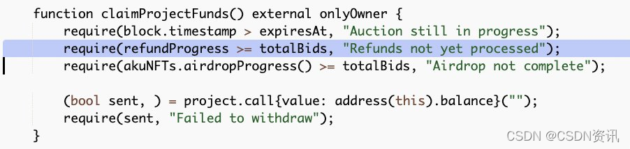 从foobar贴出的代码来看,该智能合约代码存在两个bug,第一个是用户完成投标后,状态会设为1;第二是竞标失败后退款条件状态为,因此用户无法申请退款,开发团队也无法取款,因为refundProgress ≥ totalBids,totalBids 是卖出量,而代码应该针对是的报价人数——对应 bidIndex。
