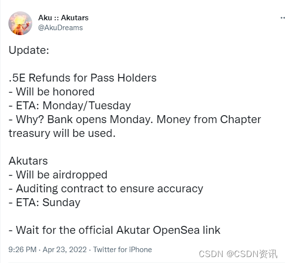 最终,Akutars决定向通行证持有者发放 0.5 个以太币退款,预计周一、周二到账。目前Akutars在@_MouseDev、@NftDoyler 和@AnonymiceNFT的帮助下,写了一份新的造币合同,并请求大家积极参与测试。