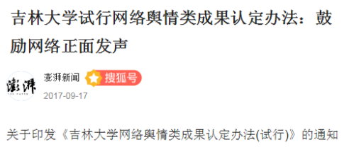 发布的《吉林大学网络舆情类成果认定办法(试行)》中,为了激励校内各单位、相关领域教职员工积极参与网络舆论正面引导、开展网上舆论斗争。具有一定学术性、创新性,并产生广泛社会影响的网络舆情类成果,经学术委员会讨论通过,