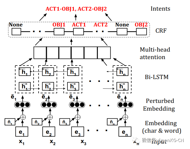 如图1所示,本文提出的OPINE框架主要包括:对抗训练,Bi-LSTM语义编码,Multi-head attention机制,带约束的CRF,生成意图等。OPINE框架相对简洁,且在各阶段都进行了精细处理。具体如下,