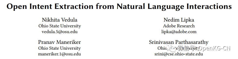 Vedula N, Lipka N, Maneriker P, et al. Open Intent Extraction from Natural Language Interactions[C]//Proceedings of The Web Conference 2020. 2020: 2009-2020.