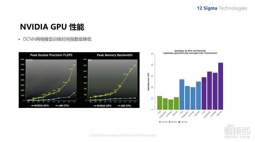 整个学习的过程在早期是没办法实现的,电脑的计算能力虽然一直有非常快速的增长,也符合之前的摩尔定律,但即使如此,计算能力也一直没办法进行这么大规模的训练量,而随着NVIDIA GPU的出现,运算能力已经远远超过原来摩尔定律的设定,最主要原因当然是因为GPU可以进行大规模的并行计算,我们知道这些特征的计算都是基于一个小的区域来进行的,而在整张图像上的不同地方都是可以并行计算的。随着GPU的发展,不同深度学习网络的运算速度尤其是训练的速度已经显著增强,GPU比CPU的速度要快出好几百倍。