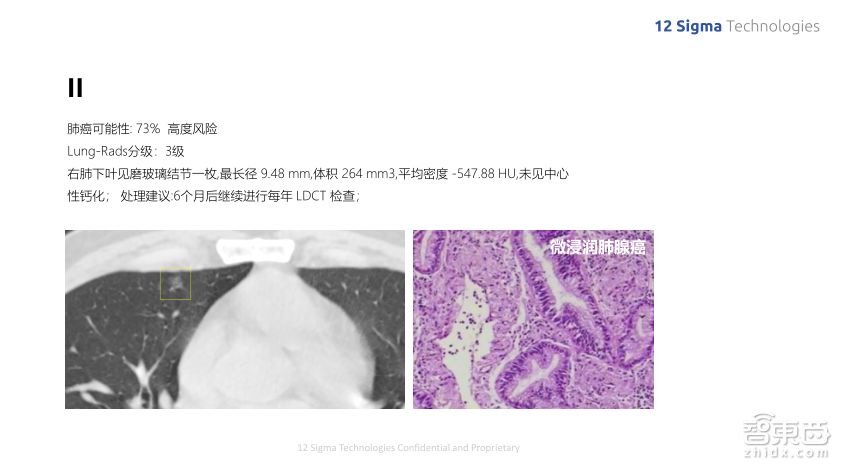 这是另外一个病例,虽然这个结节的尺寸也非常小,还不到一厘米。但是它是磨玻璃的形状,我们的算法分析出它的风险度比较高,最后实际的病理测试证明它确实是恶性的微浸润肺腺癌。