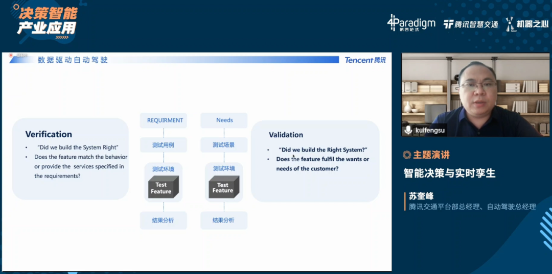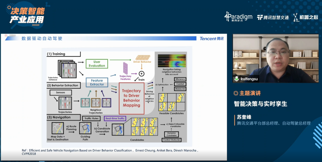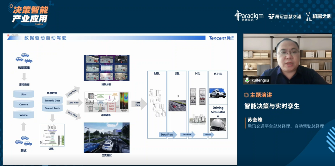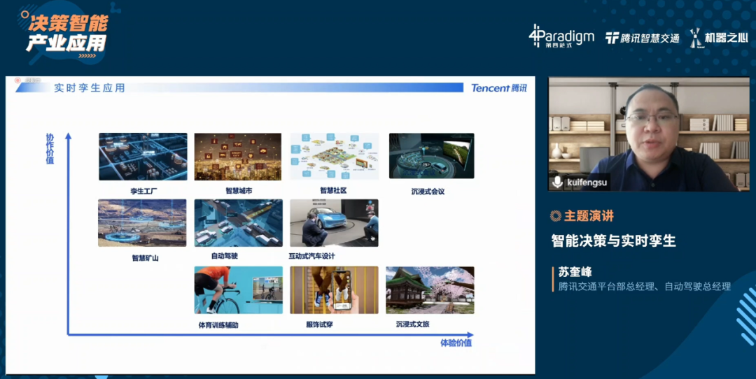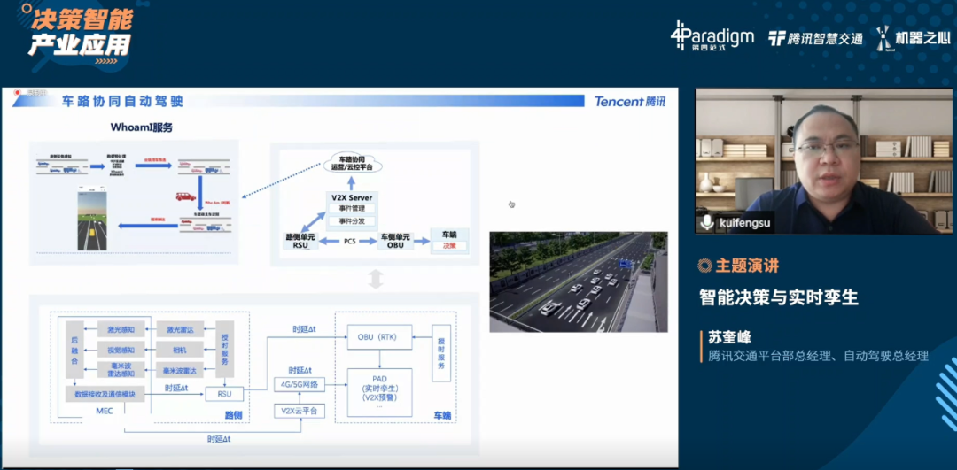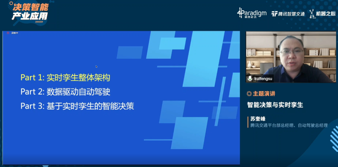 5 月 24 日,在机器之心举办的「决策智能产业应用」在线圆桌论坛上,腾讯交通平台部总经理、腾讯自动驾驶总经理苏奎峰发表了主题演讲《实时孪生与智能决策》。