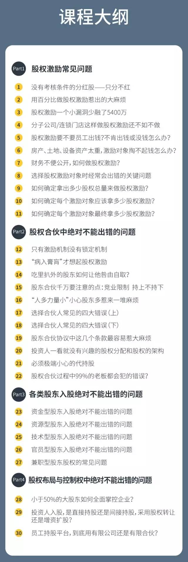 30个问题,320分钟,都是从服务过的1000多企业股权实操过程中,总结提炼出来的智慧精华;