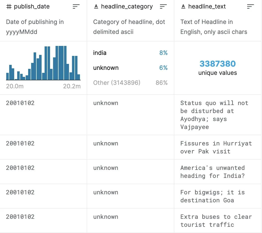 该新闻数据集是印度从 2001 年初到 2022 年第一季度的重要事件的持久历史档案,由印度记者实时记录。它包含印度时报发布的大约 360 万个事件。大部分数据集中在印度地方新闻,包括国家、城市和娱乐。由Rohit Kulkarni编写